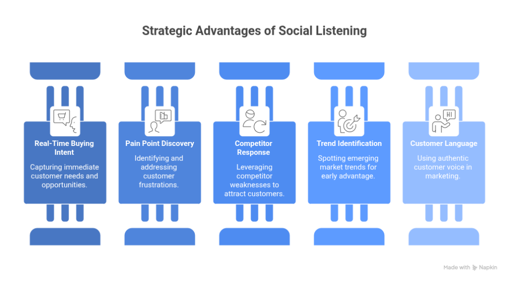 Social listening catches these conversations as they happen, often before your competitors see them.
