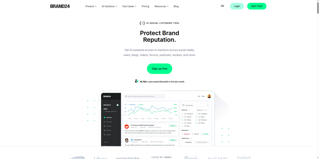 Brand24 offers a free trial that gives you full access to its social listening platform. It tracks mentions across social media, blogs, forums, podcasts, and news sites with sentiment analysis and influencer identification.