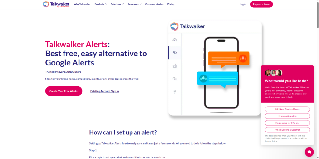 Talkwalker Alerts is a free alternative to Google Alerts with better social media coverage. Unlike Google Alerts, it monitors Twitter (X) in addition to web content.Â